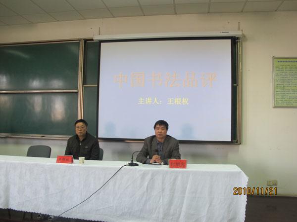 为了适应我院职教师资培养目标的要求,针对目前我院职教师资本科学生汉字书写不规范与作为教师的要求有一定差距等现实问题,夯实学生汉字书写的基本功底,我院于11月21日下午2:30,邀请著名书法家、书法评论家王根权老师在3T11教室为我院学生作“中国书法品评”的报告会。出席此次报告会的领导有院党委书记付增光、院党委副书记谢恩魁以及部分爱好书法的老师。