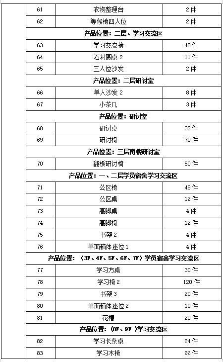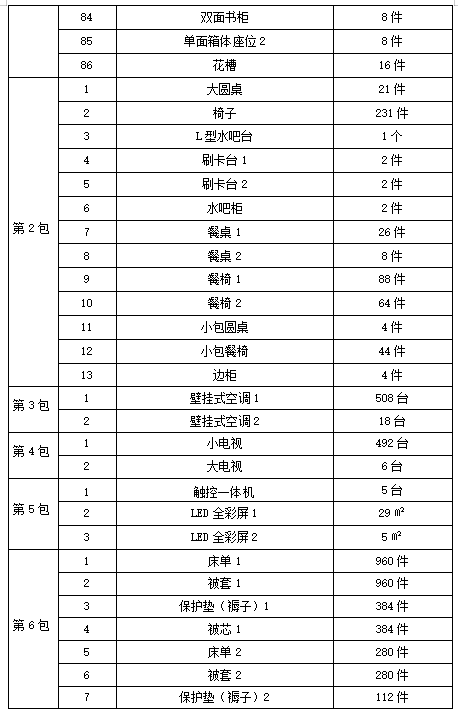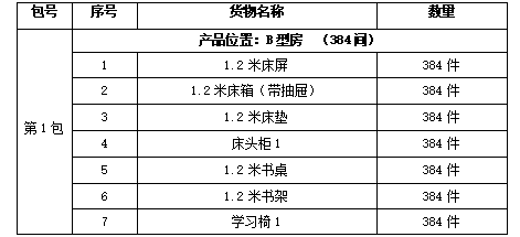 本项目共分为7个包,总采购预算:1248.6772万元(人民币),其中01包采购学员宿舍及学习研讨区家具,预算:655.7024万元;02包采购学员餐厅家具,预算:30.43万元;03包采购学员宿舍空调,预算:162.6474万元;04包采购学员宿舍电视机,预算:72.2532万元;05包采购智慧教室系统,预算:59.1852万元;06包采购学员宿舍布草及窗帘,预算:215.3144万元;07包采购学员宿舍日用品,预算:53.1446万元(具体内容和要求详见招标文件)。