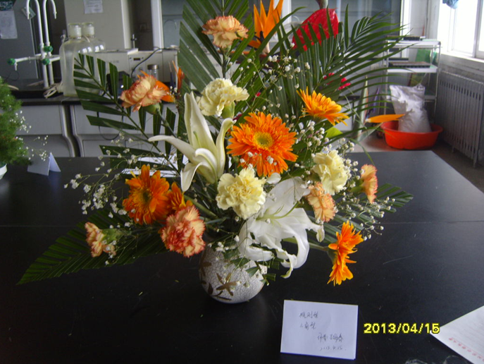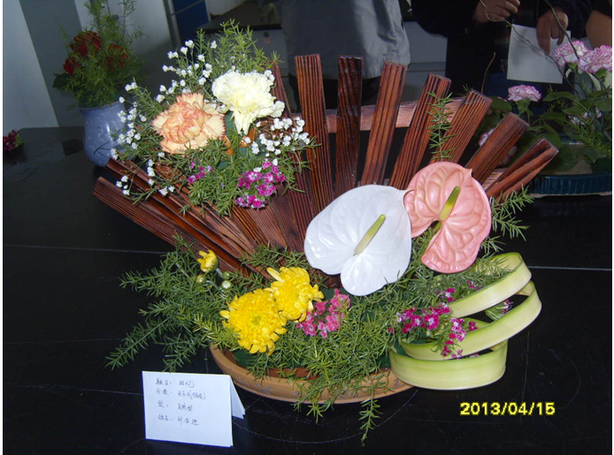 在操作实训中,学员首先确立插花作品主题,继而根据具体花材设计作品方案,然后再进行实际插花操作,将设计方案转化成具体的插花作品。学员们兴趣浓厚,积极投入到插花实践操作中,把插花的设想和方案转变成一件件寓意丰富的插花作品。