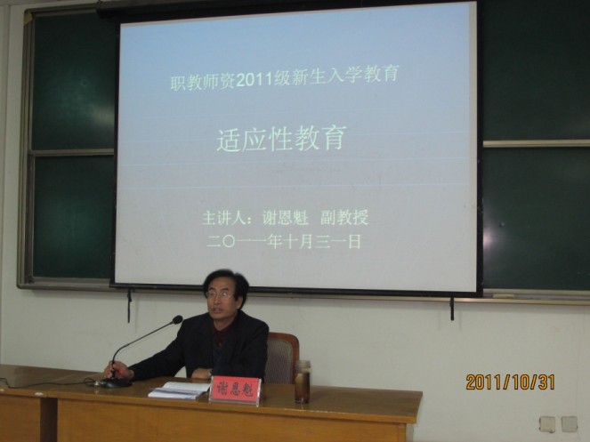 为帮助2011级新生尽快适应大学生活,顺利完成角色转变。10月31日晚,我院在3101教室举办了新生入学教育报告会。我院党委副书记谢恩魁副教授作了题为“适应性教育”的专题报告。全体班主任、辅导员与2011级新同学一起聆听了此次报告会。