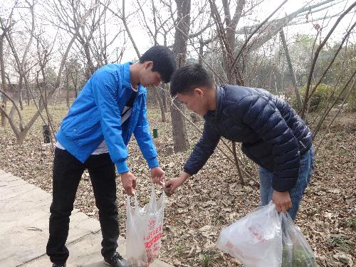 12日下午,志愿者组队前往学校博览园与园艺师傅们汇合,在园艺师傅们细心讲解植树、浇水等技巧和注意事项后,志愿者们热情高涨,根据师傅们划分的小分队有序的进行植树浇水工作。志愿者们分工明确,植树小分队有的挖树坑,有的搬小树苗,其余队员则负责盖上泥土、浇水、摘叶;清洁小分队队员则手持竹耙,干劲十足,将树林里的枯枝枯叶收集成堆,没有工具的队员们则徒手捡拾地上的树枝,最后队员们将收集起来的几十堆树叶枯枝,一袋袋运出林子。经过两个多小时的努力,树林变得格外干净,微风习习下,志愿者辛劳的汗滴滴入满载希望和爱心的土壤中。纵然土中有很多石块,大家齐心协力为小树创建了一个舒适的窝,并为它浇灌生命之水。