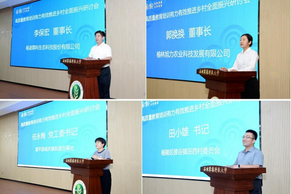 会议交流环节,校内培训教师代表张红教授就“如何提升教育培训质量,更好服务区域经济发展”进行了交流发言。陕西省退役军人就业创业促进会美丽乡村建设专业委员会代表杨凌霖科生态科技股份有限公司董事长李保宏、榆林旭力农业科技发展有限公司董事长郭换换进行了发言并表示,将会以高度的政治觉悟和实际行动投身到教育培训工作,努力成为乡村振兴的带头人、示范者和引领者,在乡村振兴的广阔舞台上发挥独特的作用。教学基地代表富平县城关镇街道办党工委书记任永梅、杨陵区揉谷镇田西村委员会村书记田小雄就如何发挥好现场教学点作用、开发资源共享、绘就美丽乡村新画卷提出了思路和设想。