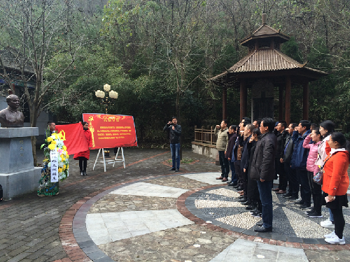 全体学员在杨文洲同志雕像前鞠躬敬仰,敬献花篮,共产党员在杨文洲同志雕像前,在鲜红的党旗下,高举右拳,重温入党誓词。