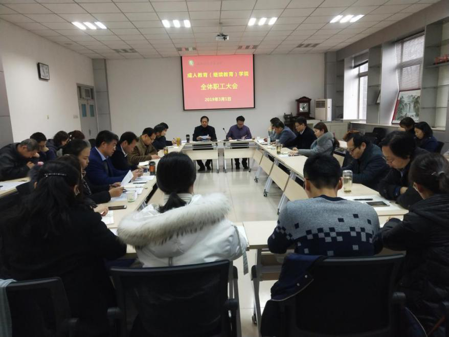 会上,宋西德首先传达了学校2019年工作会议精神。随后,王雄院长作了《mgm美高梅79906mgm美高梅799062019年工作的思考》动员报告。他讲到,学院面临重要的使命、高大的期望、信息技术的冲击和激烈的竞争等形势,背负规模经济效益、品牌质量和补齐信息化短板三座大山等压力,学院根据“深化巡视整改与本科教育建设年”的要求,继续按照“特色办学,内涵发展,提升能力,提高效益”的工作思路,全院职工解放思想、改革创新、追求卓越,围绕“一条主线三个重点”,即以“突破发展和内涵建设”为主线,在院风院貌彻底改变、规模效益、培训市场、考核机制、聘用人员管理机制、后勤保障、继续教育管理体制等方面实现新的突破。以标准化、信息化和品牌建设为重点,实现培训内容规范化和流程程序化,运行网络管理平台和教学平台,加强精品项目、精品教材、名牌课程、培训名师等品牌质量提升工程。