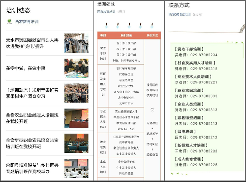 “西农教育培训”微信公众平台由学院网络培训办公室具体建设和维护,主要设有培训动态、培训领域、名师风采、培训基地、学员天地、精品课程等栏目。学院将充分利用平台方便快捷的特点,采用文字、图片、视频等多种形式及时推送学院培训工作的相关信息,展示学院的培训文化及学员风采,服务学院培训工作,加大对外宣传力度,提升培训影响力。